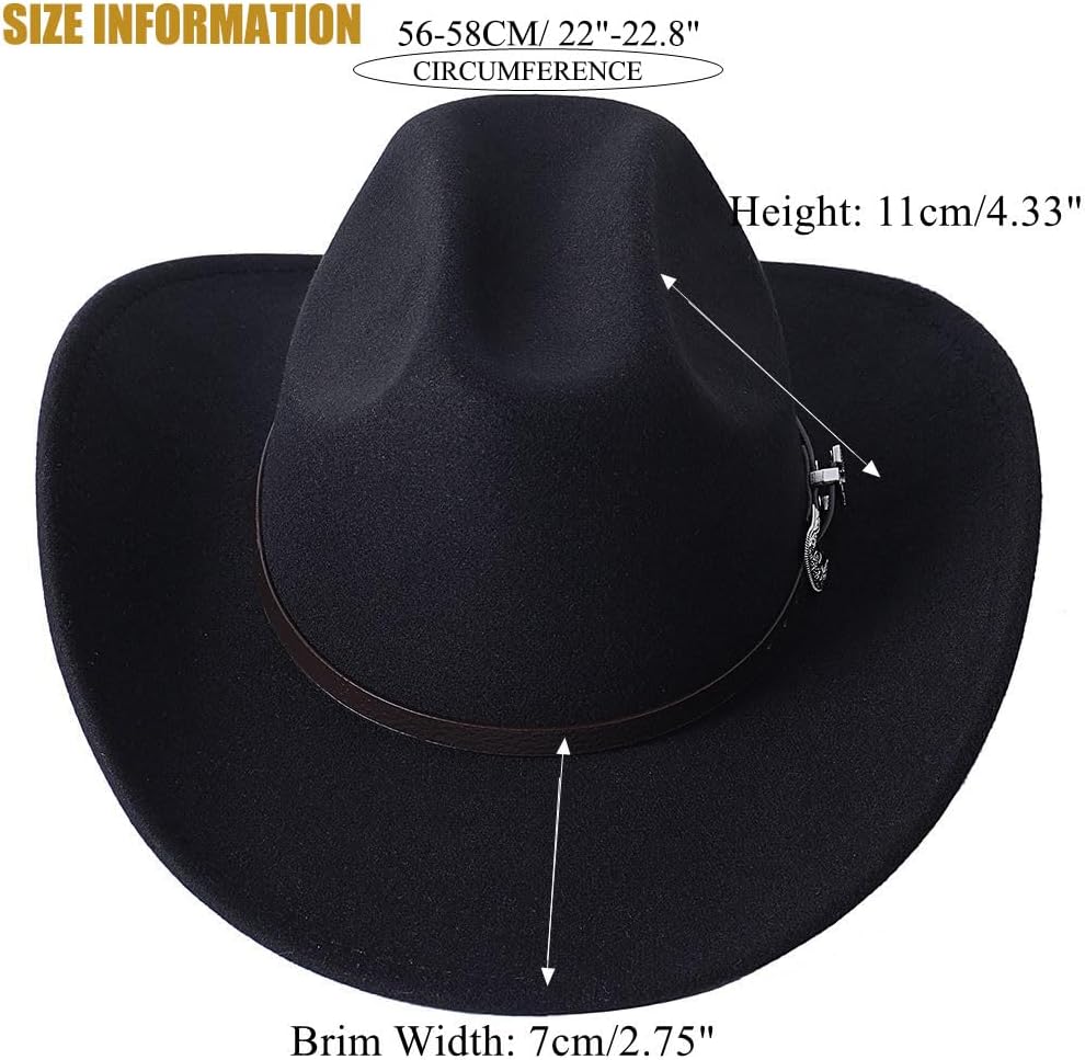 Adjustable strap inside; Hat Circumference: 56-58cm/ 22″-22.8″; Brim Width: 7cm/2.75″; Hat Height: 11cm/4.33″; Adjustable ribbon strip inside,you can adjust it according to your head when you feel large.This cowboy cowgirl hat fits most adults men and women
